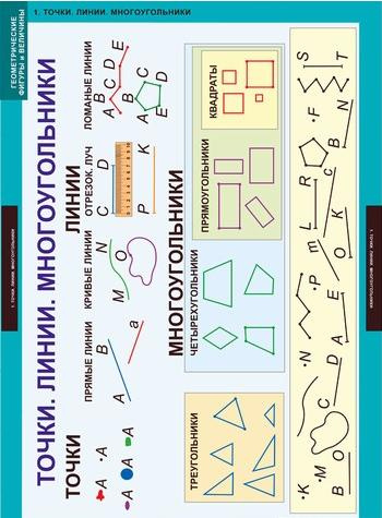 Формат 68х98 см. Учебный альбом из 9 листов.Точки. Линии. Многоугольники. Периметр многоугольника. Площадь геометрических фигур. Угол. Виды углов. Величины. Единицы времени. Единицы длины. Единицы массы. Единицы площади. Скорость. Время. Расстояние