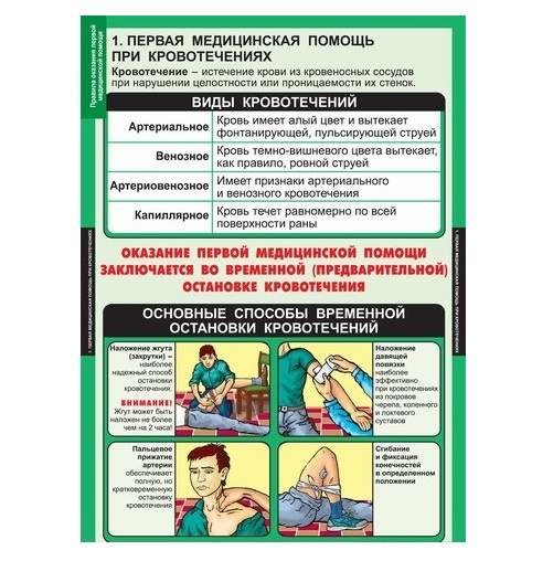 Учебный альбом из 15 листов.Первая медицинская помощь при кровотечениях. Первая медицинская помощь при переломах, растяжениях и ушибах. Первая медицинская помощь при тепловом и солнечном ударе. Первая медицинская помощь при ожогах. Первая медицинская помощь при отморожении и переохлаждении организма. Первая медицинская помощь при несчастных случаях на воде. Первая медицинская помощь при укусах животных и насекомых. Первая медицинская помощь при отравлениях. Первая медицинская помощь при поражении сильдействующими ядовитыми веществами. Первая медицинская помощь при поражении электрическим током. Первая медицинская помощь при остановке сердца. Правила наложения повязок. Правила проведения искусственной вентиляции легких и непрямого массажа сердца. Правила транспортировки пострадавших.