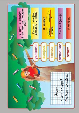 Формат 68 х 98 см.Учебный альбом из 2 листов.Что такое задача ? Решение задач.Раздаточный материал - карточки 256 шт.