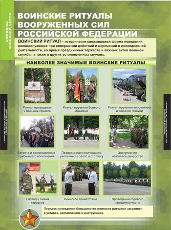 Формат 68х98 см. Учебный альбом из 10 листов.Воинские ритуалы Вооруженных Сил Российской Федерации. Боевое знамя воинской части. Военная присяга. Военная форма одежды Вооруженных Сил Российской Федерации. Государственные награды Российской Федерации.