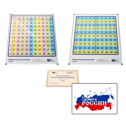 Плакат двусторонний - на одной стороне изображена таблица умножения, на другой сотенный квадрат. В комплект входят накладные магнитные элементы (полосы, рамки, квадраты) и маркеры, а также методические рекомендации для учителя.