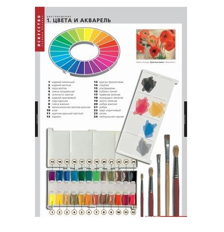 Учебный альбом из 18 листов.Цвета и акварель. Ахроматическая гармония. Типы смешения красок. Теплые и холодные цвета в живописи. Цветовой тон. Светлота и насыщеность. Перспектива в живописи. Светотени в сюжетных композициях. Восприятие контрастов. Гармонизация цвета. Классификация цветовых гармоний. Цветовая композиция. Колорит. Значение цвета. Символика цвета в иконописи. Цвет в интерьере. Круг естественных цветов по Гёте. Цветовые системы Рунге и Освальда. Цветовая система Менселла. Цветовая система в полиграфии.