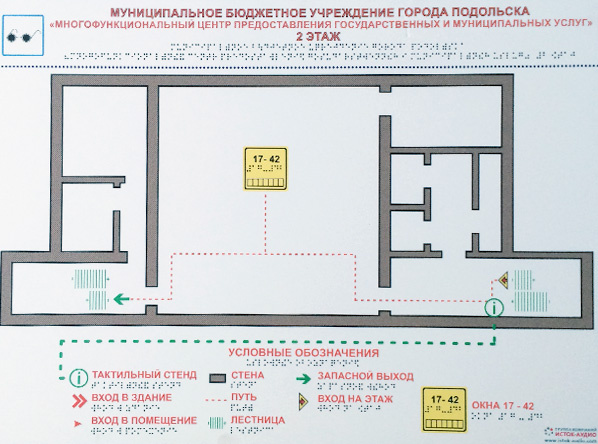 Рельефный план помещения или территории. Дизайн предоставляется заказчиком. Сочетает в себе тактильные (плоско-выпуклые) элементы схемы и путей движения и надписи, нанесенные рельефным способом и дублированные азбукой Брайля.