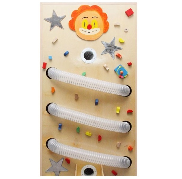 На корпусе панели установлена прозрачная труба, по которой скатываются мячики на глазах у наблюдающего. Снизу крепится специальный лоток для мячей. Если мячик бросить в верхнее отверстие - он, прокатившись через трубочки, выкатится снизу в лоток. Также на корпусе закреплены предметы, способствующие развитию тактильного, визуального и звукового восприятия.