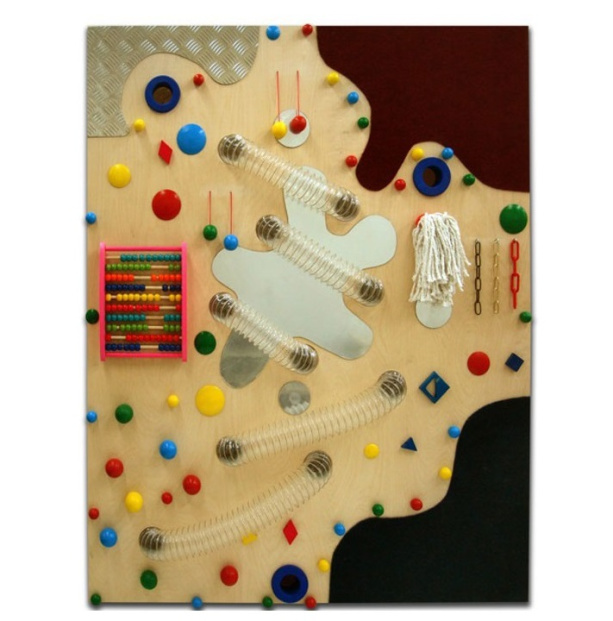 На корпусе панели установлена прозрачная труба, по которой скатываются мячики на глазах у наблюдающего. Снизу крепится специальный лоток для мячей. Если мячик бросить в верхнее отверстие - он, прокатившись через трубочки, выкатится снизу в лоток. Также на корпусе закреплены предметы, способствующие развитию тактильного, визуального и звукового восприятия.