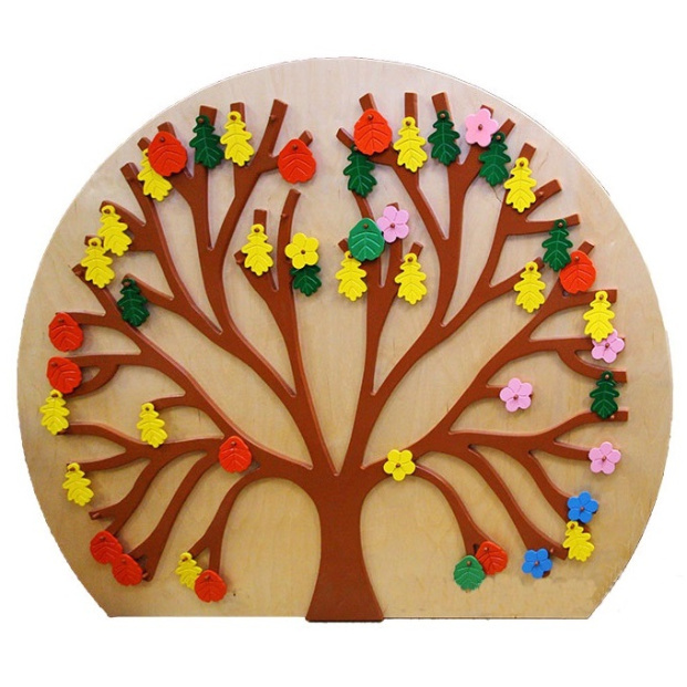 Тактильно-развивающая панель "Времена года" состоит из деревянного основания - ствола с ветками, на которые можно вешать листья и цветы. Цвет листьев - разный.