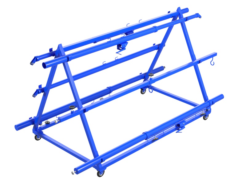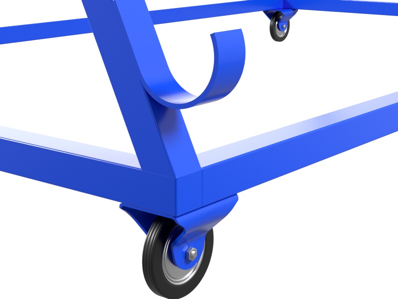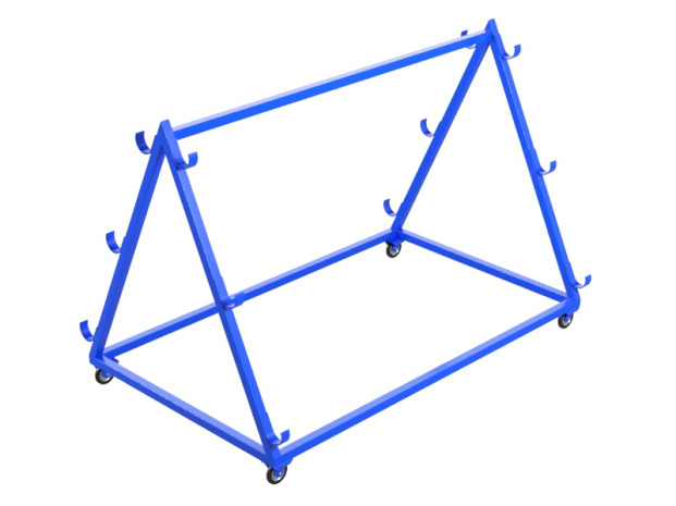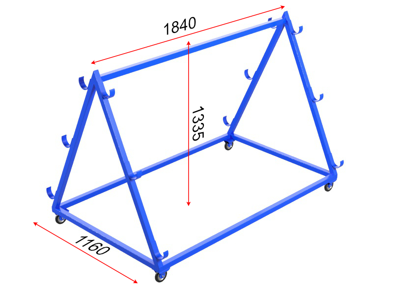 Тележка для хранения и перевозки волейбольных стоек представляет собой цельносварную конструкцию из профильной трубы 40х40х1,5 мм, установленную на колесные опоры с резиновым покрытием, обеспечивающим мягкое перемещение по различным повехностям.