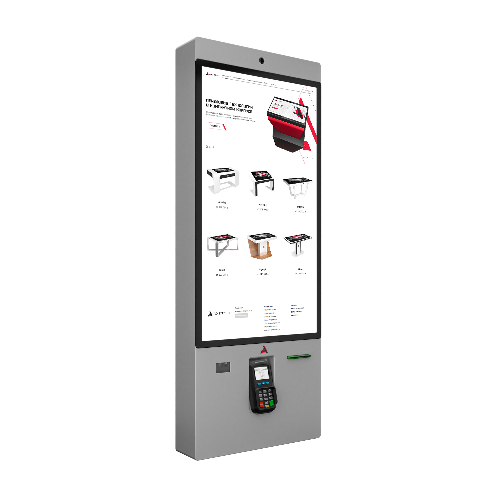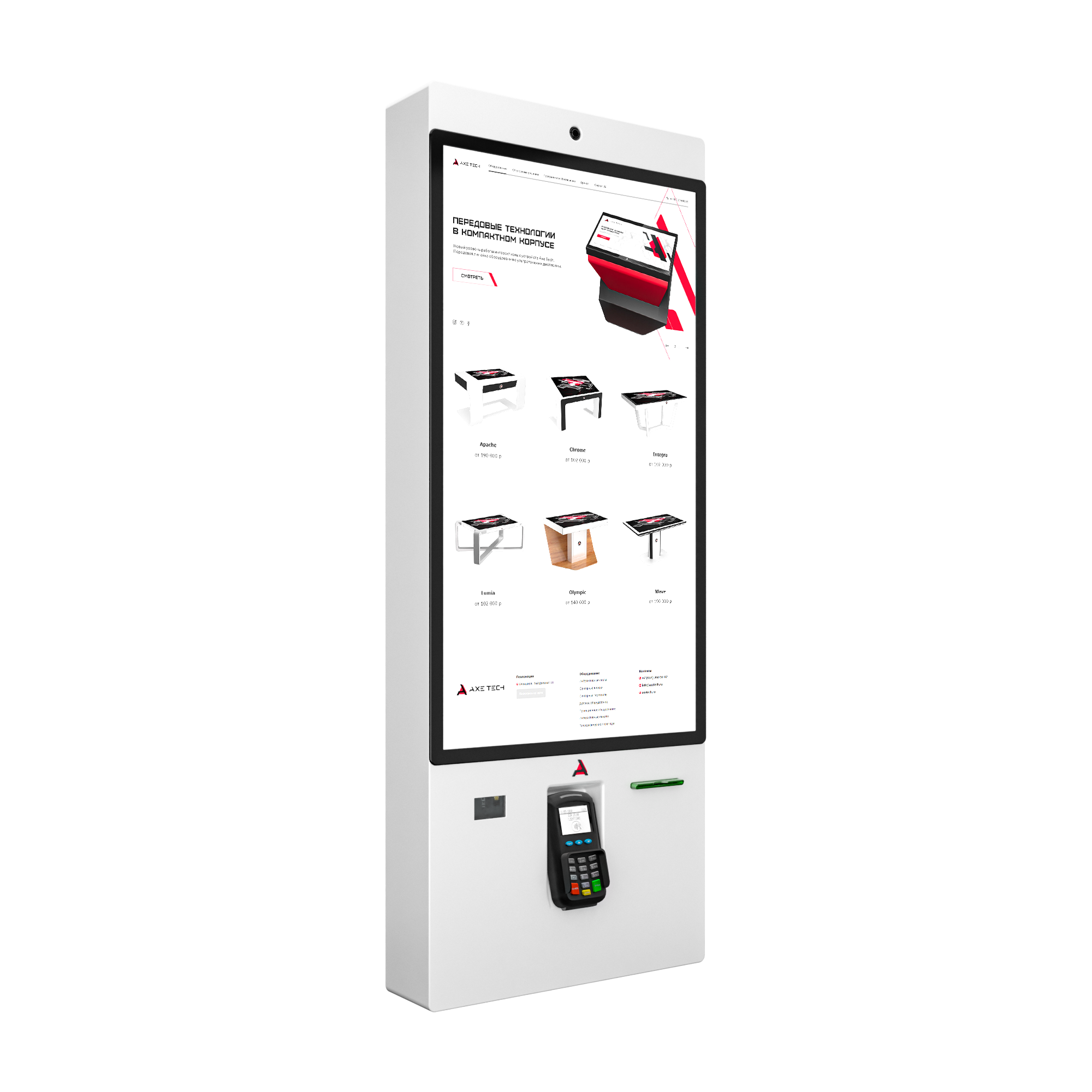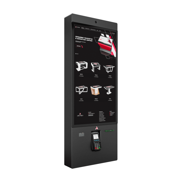 Терминал самообслуживания Legacy компактное устройство настенного исполнения для автоматизации работы кафе, кинотеатров, музеев и других заведений, где требуется осуществить заказ или купить билеты без участия персонала. При необходимости терминал может быть оснащен дополнительными комплектующими: сканером штрихкодов, считывателем карт лояльности, широкоугольной камерой и другими устройствами.