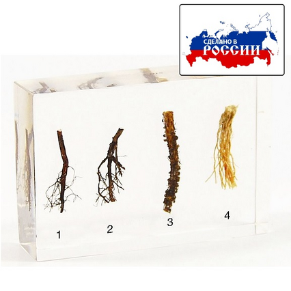 Коллекция представляет собой корневую систему четрёх различных растений в натуральную величину, запаяных в прозрачный акрил. Пособие предназначено для изучения разнообразия растений, особенностей строения корневых систем. Имеется вкладыш со списком образцов.