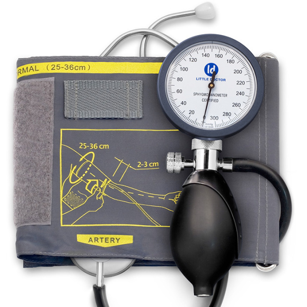 Тонометр механический. Корпус анероидного манометра создан из прочного металла. Диаметр циферблата составляет 44 мм.