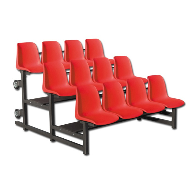 Мобильная 3-х рядная трибуна на 12 мест, с пластиковыми сидениями. Транспортировочные колеса, расположенные по задней стенке трибуны, позволяют при необходимости ее перемещать. Количество посадочных мест