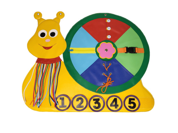 Дидактическая игрушка " Улитка" способствует сенсорному развитию детей и тренировке мелкой моторики рук. С помощью коврика ребенок запомнит цвета, научится шнуровать, завязывать узлы и плести косы, застегивать и расстёгивать молнию, пуговицы, пряжки и т.д.Панно крепится к стене с помощью люверсов.