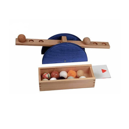 В комплекте – рычажные весы из лакированного дерева, уложенные в деревянную коробку с выдвижной крышкой из оргстекла; 12 шариков из разных материалов – пенополистерола, воска, камня, резины, синтетического мха, пробки, картона, буковой и липовой древесины, войлока и фарфора, а также шерстяной клубок.