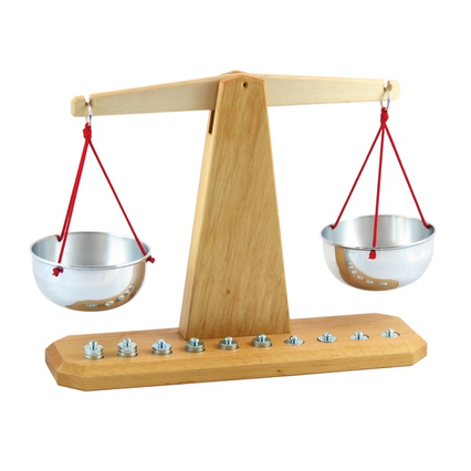 Деревянные весы с 2 чашами для взвешивания и 10 гирями (весом от 10 до 50 г).