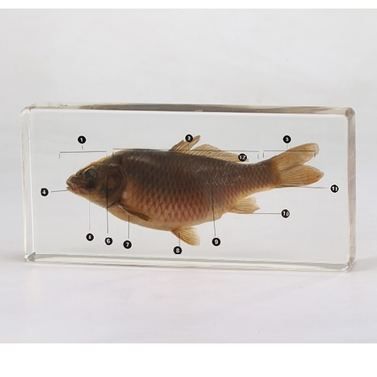Учебное пособие представляет собой образец рыбы в пластиковом прозрачном блоке преданазначено для изученя внешнего строения рыбы в курсе биологии, естествознания.
