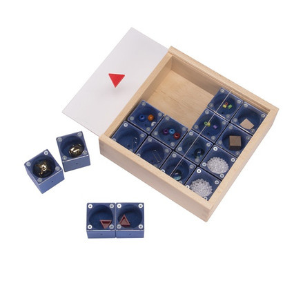 16 полых, покрытых цветным лаком кубиков с различными наполнителями, которые при встряхивании кубиков производят разные звуки. Кубики уложены в деревянную коробку с выдвижной крышкой из оргстекла. Одна из граней каждого кубика закреплена винтами, так что ее можно снять и поменять наполнитель. Можно организовать игру в группе из 16 человек, в процессе которой каждый ребенок будет искать себе партнера с таким же наполнителем кубика, как у него самого, а потом они постараются определить, что это за наполнитель, и описать его словами.