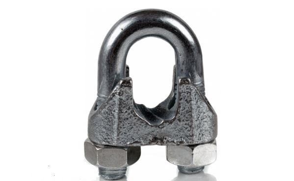 Зажим канатный изготавливается ковано – штамповочным методом. Представляет собой скобу с резьбой и гайками по концам и основу – перемычку с двумя отверстиями и выемкой для точной подгонки и закрепления тросов и канатов. Закрепление троса происходит путем затягивания гаек на концах скоб. Зажимы применяются для соединения тросов между собой и для изготовления петель на концах троса. Этот тип изделия является бытовым и предназначен для небольших нагрузок.