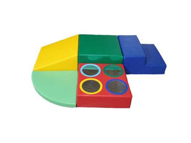 Набор состоит из 5 модулей разных форм с игровыми элементами: Прямоугольный параллелепипед 50*50*25 -1шт, Прямоугольный параллелепипед с безопасными зеркалами 50*50*15 - 1шт, ступенька 50*50*25см- 1шт,, горка 50*50*25- 1шт, мат-сектор r-50см, h-5см. – 1шт.