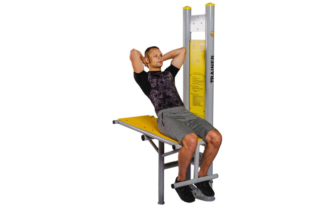 Укрепляет мышцы живота. Его можно соединить вместе с тем же или другим устройством на средней плате. Особенно рекомендуется в тандеме с растяжкой для ног.